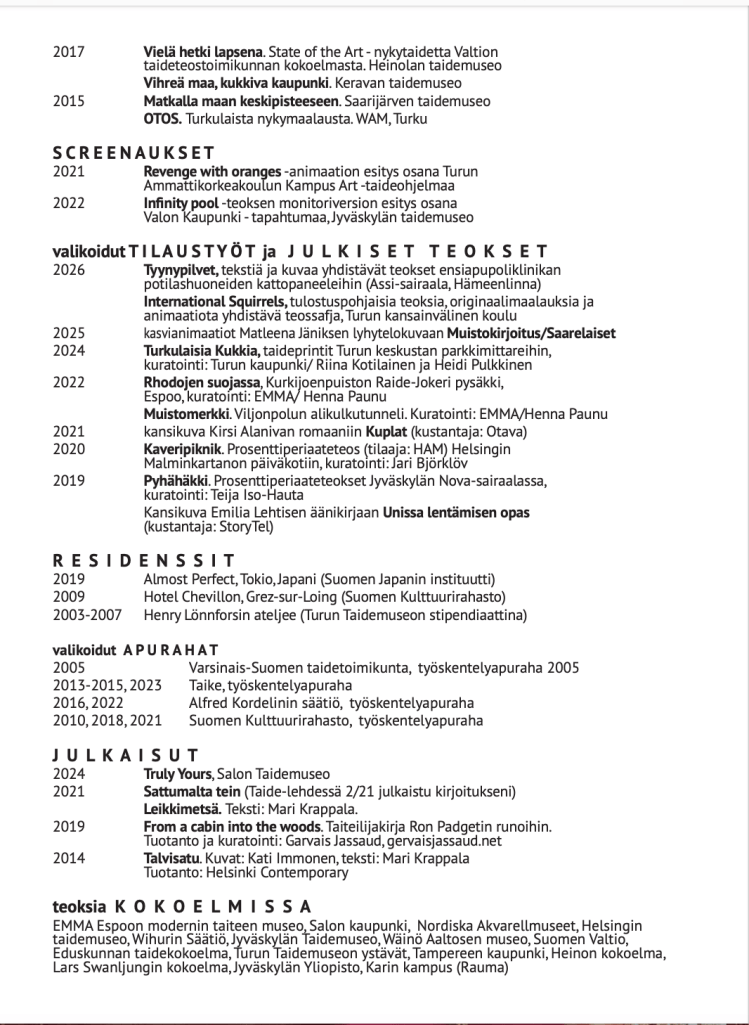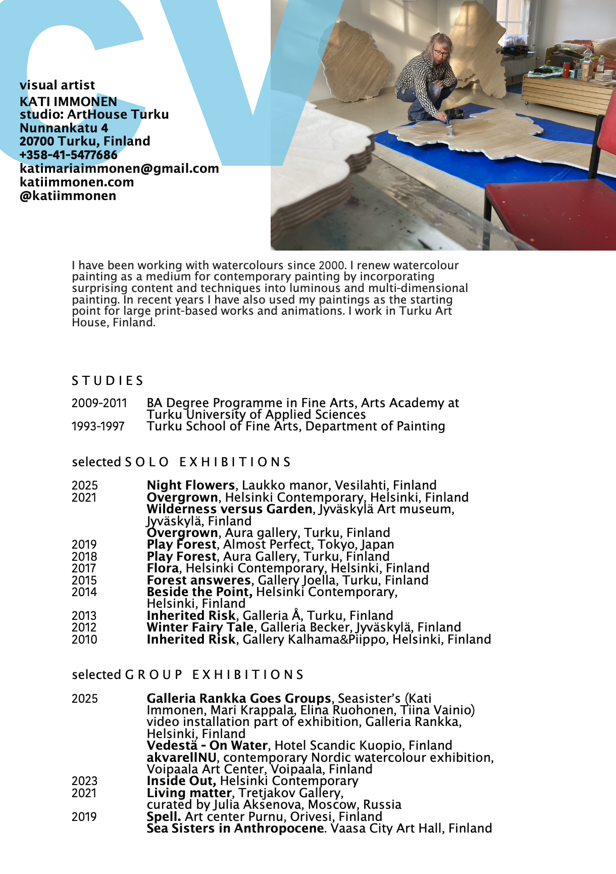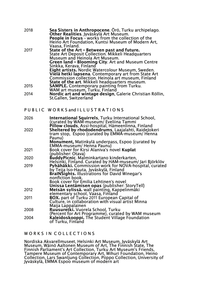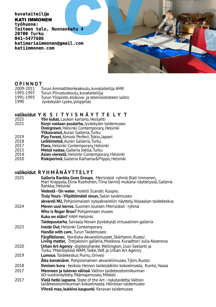 Kati Immonen graduated from the Turku School of Fine Arts in 1997 and has since exhibited her work extensively in Finland and abroad. In recent years, her works have been exhibited at venues such as Laukko Manor, Helsinki Contemporary, and the Jyväskylä Art Museum. Her works are included in several Finnish collections and at the Nordic Watercolor Museum in Sweden. Immonen has created several public artworks throughout Finland, most recently at the Turku International School in 2026. The artist has also created numerous book covers and illustrations for various publications.