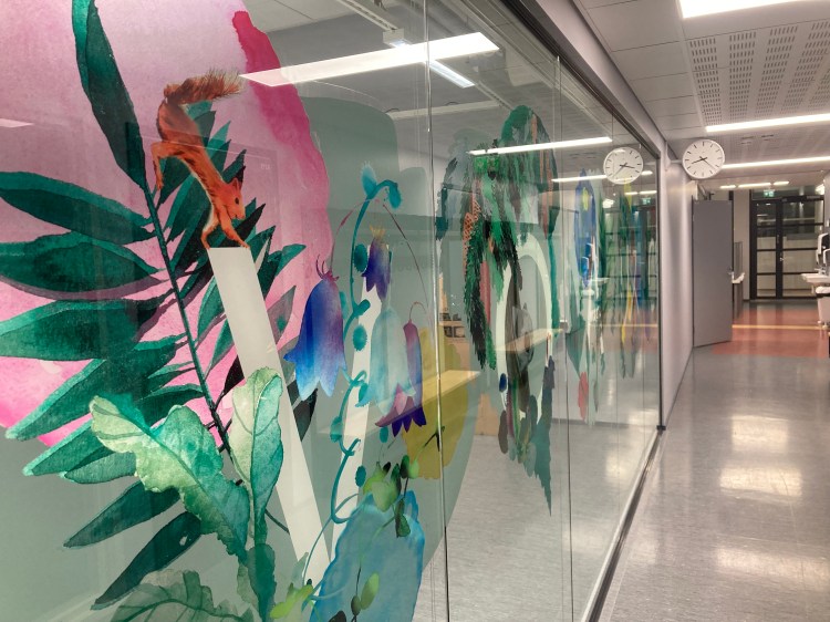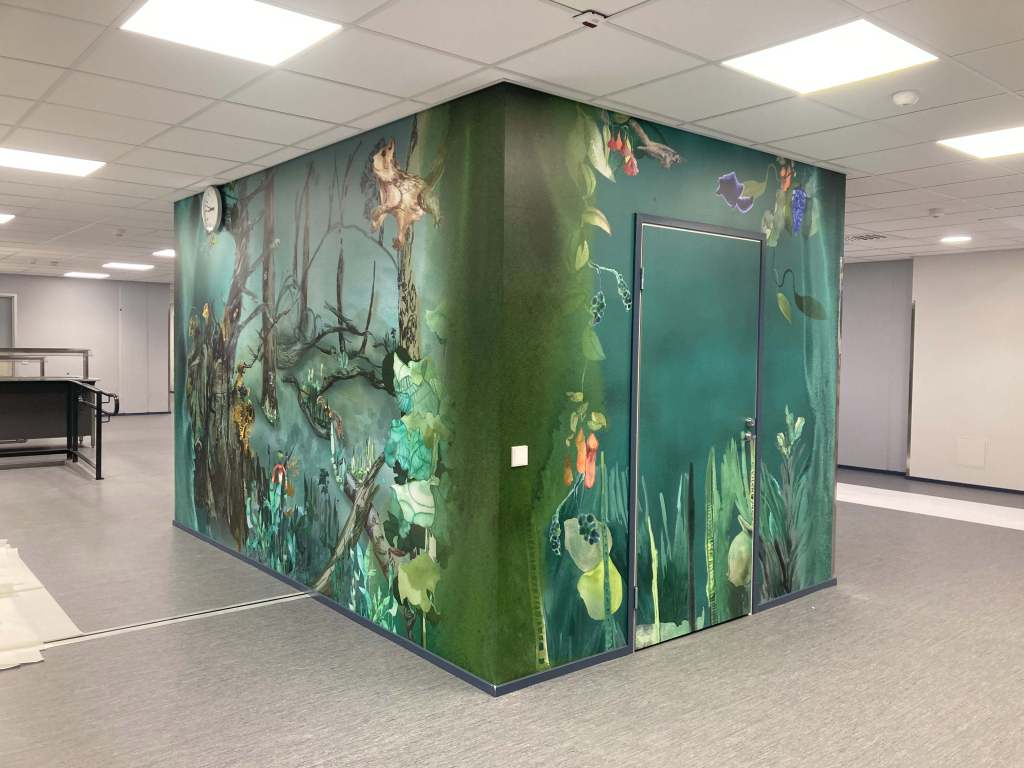 A bespoke piece celebrates the lobby, the school dining room and catches the eye on the door of the patient’s room in print. I do commissioned work for public places, companies and private clients. My commissioned works are often based either on my own paintings or on stories related to the chosen location of the work.